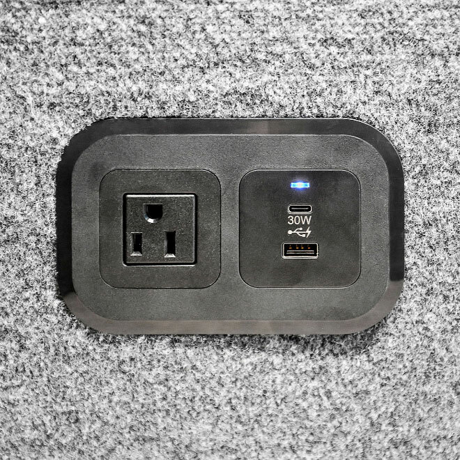 Plug-and-play power with power outlet, dual USB-A/-C charging ports, and CAT6 ethernet port